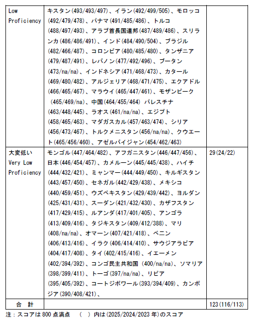 対象国の英語能力を「非常に高い」(Very High Proficiency、800点満点中600点以上)、「高い」(High Proficiency、550点~599点)、「標準的」(Moderate Proficiency、500点~549点)、「低い」(Low Proficiency、450点~499点)、「非常に低い」(Very Low Proficiency、450点以下)という5段階に分けてランク付けをしている。