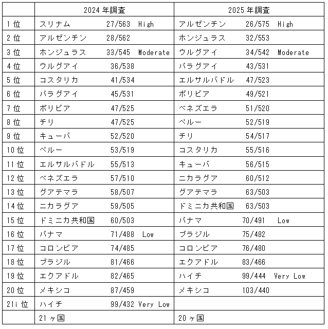 下記表3の2025年と2024年によって過去1年間のランクと得点の推移をみよう。2025年と2024年を比較すると、7ヶ国がランクを順位を上昇させており、12ヶ国が下落している。1ヶ国は変化なしとなっている。急激にランクと得点を上げている国は、エルサルバドル(+8位、+10点)、ブラジル(+6位、+16点)、ベネズエラ(+6位、+10点)である。反対に急激にランクと得点を下げている国は、メキシコ(-16位、19点)とコスタリカ(-14位、-18点)である。